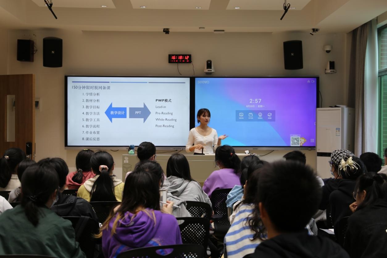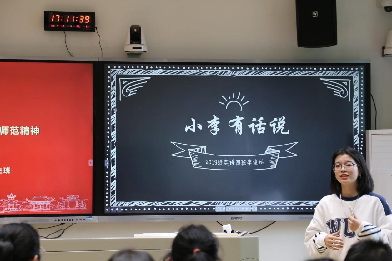 系列讲座第一讲主题为“培养教师素养,传承师范精神”为主题。邀请到学院历届荣获全国师范生技能竞赛一等奖获奖学生为新生分享师范初心和在师范技能培养路径。2021级英语教育专业研究生蔡蕴鑫以“师范生的‘元技能’”为主题,提出了优秀师范生应具备的六项技能:熟练使用教学软件、掌握教学设计基本功、语音语调、控场能力、自信大方及丰富的知识积累。2019级英语专业本科生李俊廷就微课、文本解读、学习心得三个方面分享了经验。