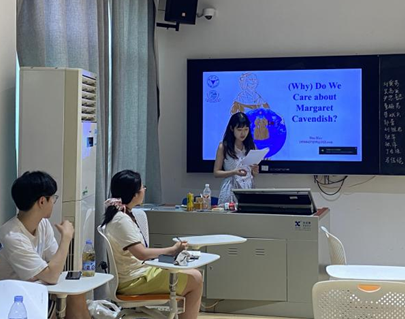 6月26日,由舒好和金彦利两位同学进行研究汇报。舒好同学首先以莎士比亚引出Cavendish,Cavendish不仅是英国第一位以真名发表作品的女性,也是第一位书写乌托邦科幻的女性作家。舒好同学进一步从《圣经》和医学的角度,介绍了当时女性写作的困境,并提出一个争议问题,即“Cavendish本人是否是一名女性主义者?”对此,舒同学提到有很多学者认为,她虽然塑造了很多女性角色,但是其自身并没有脱离阶级局限性,作为一名保皇派,她支持父权制的社会结构,因此其女性主体性的构建不免带有帝国主义色彩。接着舒同学介绍了乌托邦虚构小说The Blazing World,并结合上午讲座的一篇小说《月中人》进行了对比分析。最后得出结论,了解Cavendish可以理解17世纪文学的图景,关心当代人类生存现状与社会问题。