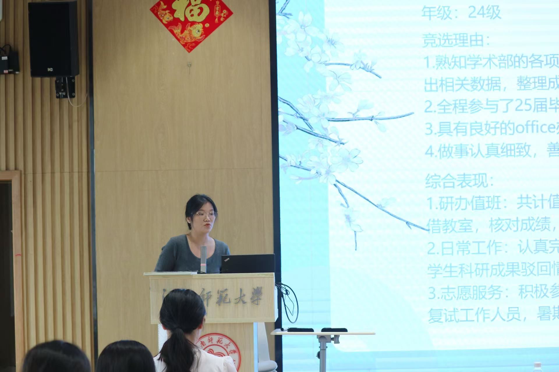 在干事竞选发言环节,各部门候选人依次上台,结合自身工作经历与未来规划进行竞选陈述。其中,学术部张曼曼同学分享了在部门工作中积累的经验与感悟,表达了继续以“严谨、负责、高效、服务”理念服务同学的决心;组织部刘琪同学回顾了过去一年在活动组织、讲座协调等方面的实践收获,展现了进一步锻炼自我、贡献学院发展的强烈意愿。各位候选人的发言充分展现了外院研究生骨干的责任担当与蓬勃朝气。