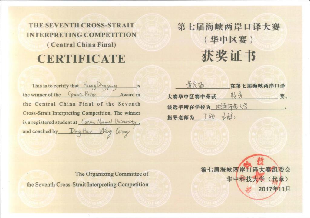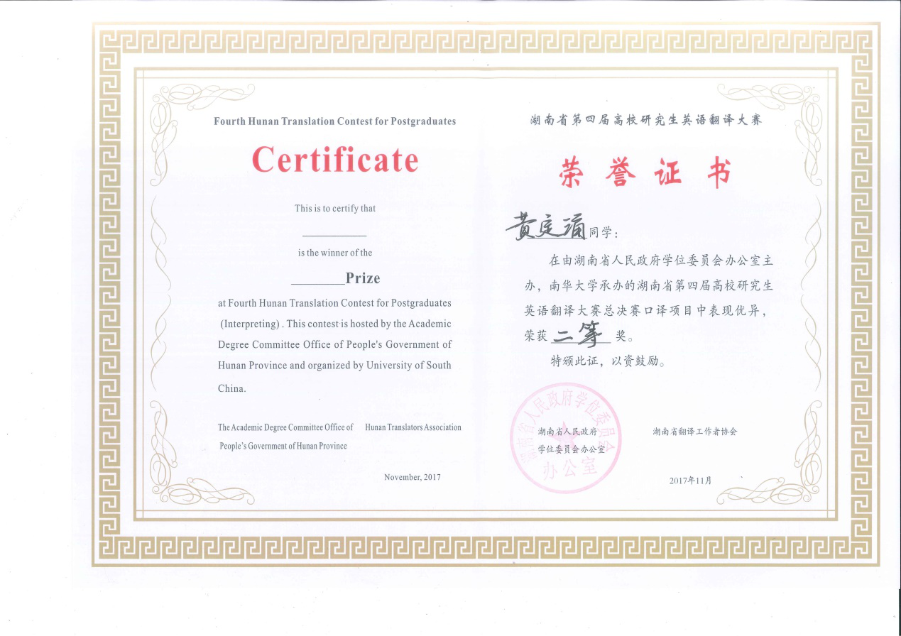 2017年11月11日上午,湖南省第四届高校研究生英语翻译大赛在南华大学MBA教育中心一楼学术报告大厅成功举办。此次活动由湖南省教育厅主办,南华大学研究生院、语言文学学院承办。主旨口译,对话口译和会议口译三个环节之后,黄定涌同学获湖南省第四届高校研究生英语翻译大赛口译项目二等奖。