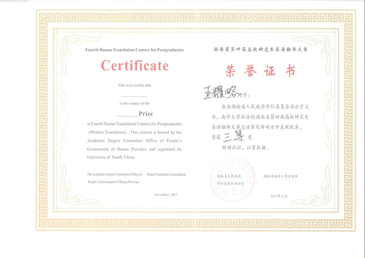 2017年11月11日上午,湖南省第四届高校研究生英语翻译大赛在南华大学MBA教育中心一楼学术报告大厅成功举办。此次活动由湖南省教育厅主办,南华大学研究生院、语言文学学院承办。最终,王耀略同学荣获湖南省第四届高校研究生英语翻译大赛笔译项目三等奖。