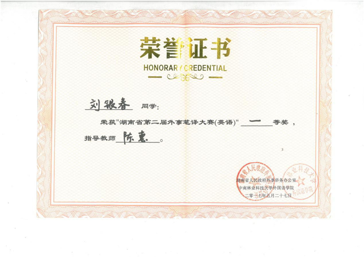 2017年5月27日,由湖南省人民政府外事侨务办公室主办,中南林业科技大学承办的湖南省第二届同声传译大赛和外事笔译大赛在我校举行。本次大赛,旨在为湖南省外向型经济发展发现和储备高级口译人才和外事笔译人才,推进湖南省外事翻译人才库建设,实现湖南省涉外单位和高级翻译人才的对接。来自湖南省内23所高校的251名本科生和63名硕士研究生相聚林大,“译”决高下。本次大赛参赛人数多,参与院校广,同时新增了日语外事笔译,让更多热爱翻译的高校学生能够欢聚“译”堂。最终,刘银春同学荣获湖南省第二届外事笔译大赛(英语)一等奖