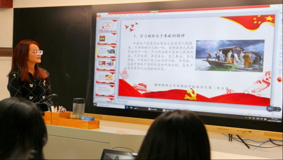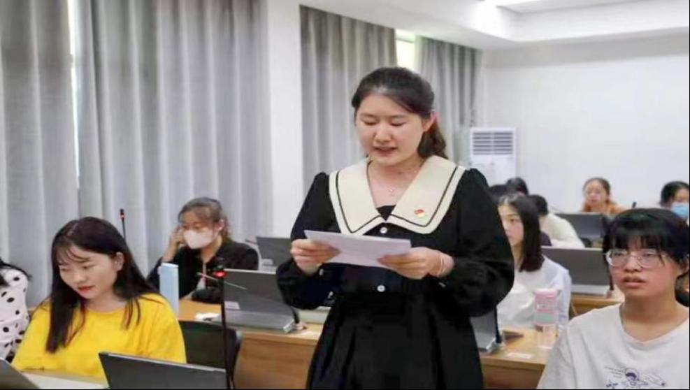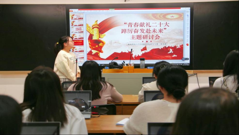 会议共分为四个部分。活动伊始,全体党员重温入党誓词,感受涌动之初心。随后,观看党的二十大系列学习视频,见证党从筚路蓝缕到奠基立业的百年光辉奋斗历程。而后,全体党员以分组的形式对“二十大报告金句”展开了激烈的讨论,徐敏赟、林鑫、石丽青同志分别从党的带领下祖国的变化和发展、大学生的职业发展、外语学子的初心和使命分享自己的体悟。最后宋建茹、魏兆妍、秦玥等七位党员从切身实地的感受出发对全过程人民民主、当代青年人的应有精神及担当、中国的文化及文明发展等方面进行了诠释。至此,研讨会圆满结束。