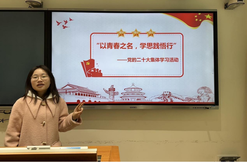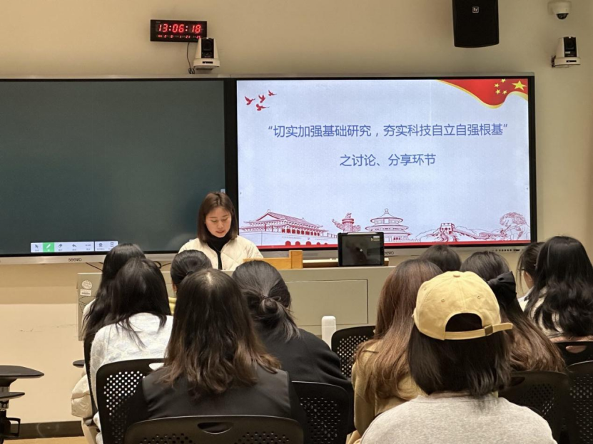 活动伊始,党支部副书记石丽青同志介绍了本次党日活动的主题,组织党员同志观看了习近平总书记主持二十届中共中央政治局第三次集体学习上的重要讲话,习近平总书记在会上强调“切实加强基础研究,夯实科技自立自强根基”,作为英语语言文学专业的学子,支部内党员同志就此展开了认真的讨论,党员钟义菲和姚娇分享了自己的学习心得,表示在语言学习上应做到知识互融,扎实英语学习基础,努力成长为知识复合型人才。