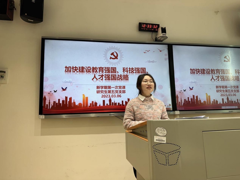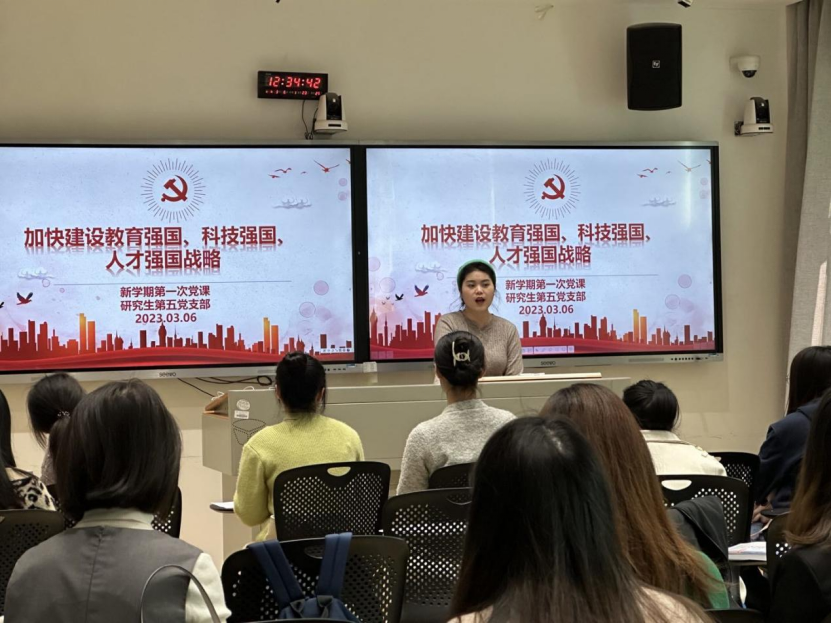 (通讯员:李文璇)2023年3月6日,永利集团3044欢迎光临研究生第五党支部书记王佳老师在腾龙楼304为支部党员讲授了新学期第一堂党课,主题为“加快建设教育强国、科技强国、人才强国战略”。