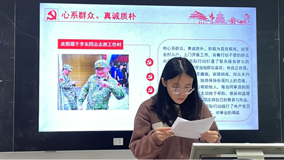 随后,预备党员廖奕杭、张婧、王紫盈围绕“传承榜样力量,践行使命担当”主题进行学习汇报。李东同志作为在习近平新时代中国特色社会主义思想教育指引下成长起来的新时代优秀青年党员代表,是在防汛救灾大战大考中坚守基层、无私奉献的基层党员干部的缩影,更是用生命践行党的初心使命的先进典型。英雄虽逝,精神长存。廖奕杭同志提出,全体党员应深入学习李东同志全心全意为人民服务的情怀、对工作高度负责的态度、严于律己的修身准则和向上向善的道德风尚,积极向榜样靠拢。
