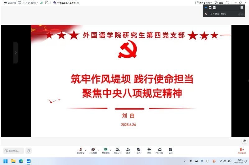 (通讯员 易圆)为深入贯彻党中央全面从严治党战略方针,切实增强党员干部廉洁自律意识,2025年6月27日中午,永利集团3044欢迎光临研究生第四党支部通过线上会议形式开展了“筑牢作风堤坝 践行使命担当——聚焦中央八项规定精神”专题党课。本次党课由永利集团3044欢迎光临副院长刘白教授主讲,党支部书记侯奇焜同志主持,支部全体党员参会。