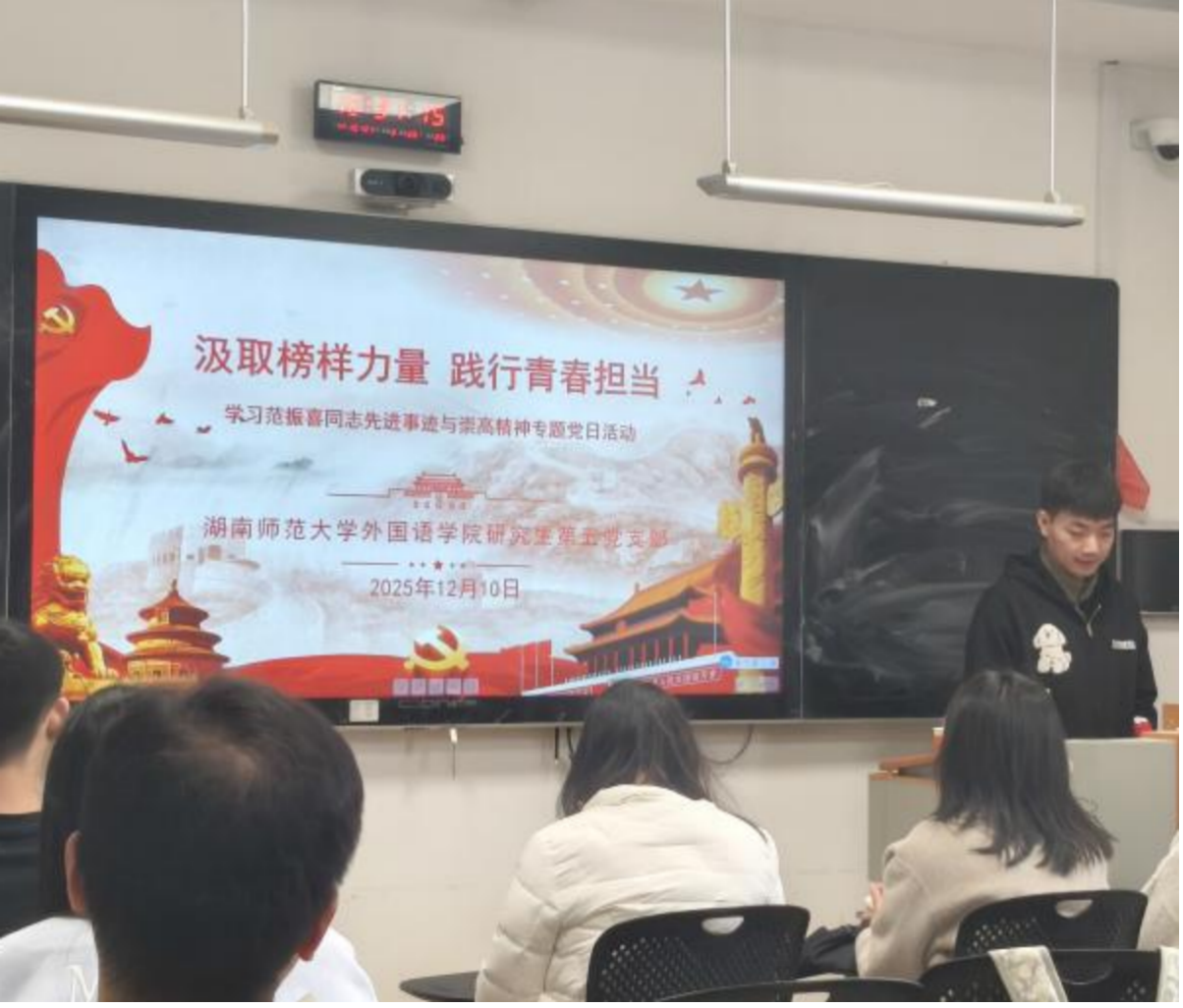 (通讯员 廖锦叶)为深入学习时代楷模的崇高精神,引导青年党员筑牢信仰之基、践行初心使命,2025年12月10日,永利集团3044欢迎光临研究生第五党支部于腾龙楼406教室开展“汲取榜样力量 践行青春担当——学习范振喜同志先进事迹与崇高精神”主题党日活动。活动由支部副书记张维东同志主持,支部全体党员及第78、79期入党积极分子参加。
