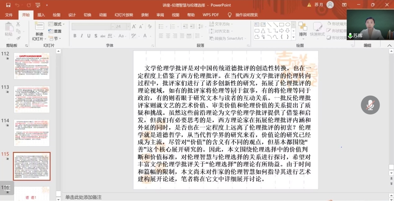 随后,苏晖教授阐释了文学伦理学批评关于伦理选择理论的特点、价值和意义。她指出,文学伦理学批评以“伦理选择”为理论基础和核心术语,强调通过阐释和评价各类人物伦理选择的途径、过程和结果,给人们以道德教诲和警示。由此,文学伦理学批评将文学批评和研究从传统中对人物性格、心理和精神的分析转移到对伦理选择活动的分析上来,引起了批评和研究范式的转变。