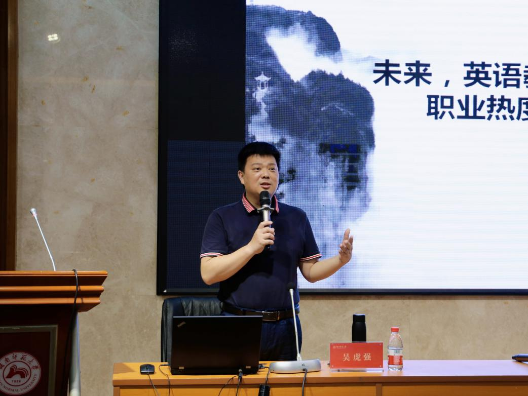 5月13日上午,长沙青竹湖中学党委书记吴武夫在腾龙楼515报告厅开启第一场讲座。吴武夫从英语教师职业现状入手,讲述了作为一名英语教师的义务与责任以及教师职业带来的光荣感和满足感。他指出,一名优秀的老师不仅要具备充足的知识储备,还需要有一定的抗压能力和专业的管理技巧,教师需要进行技能的培训以提高个人素养。与此同时,他还表明,教师还需要让自己和学生保持幸福感。这就需要教师了解自己和学生,关注学校和社会,不断提升自身能力,努力让自己获得学生的尊重和喜爱。讲座由学工办主任张元强老师主持。