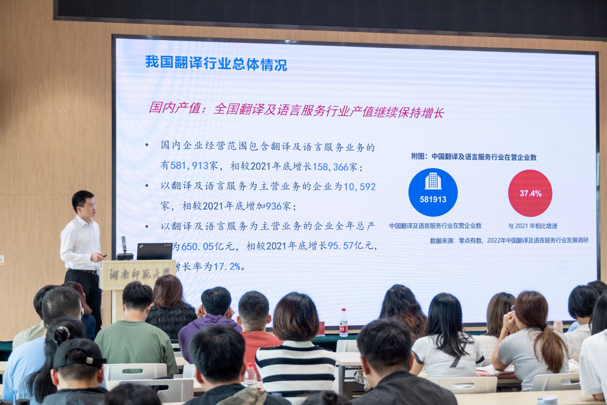 邢玉堂从我国翻译行业总体情况、重大翻译任务组织实施、高层次翻译人才培养和口笔译实践四个方面详细地分析了讲座主题。首先,他列举相关数据图表,阐明我国翻译行业规模不断增长、语种需求多元化、翻译行业从业人员数量不断增加等现实情况,同时提出机器翻译未来前景可观。邢玉堂也指出,中国翻译专业人才培养中仍存在专业培养与实践脱节、非通用语种翻译人才短缺、翻译实践缺乏等问题,很好地契合了本次讲座的主题,同时也加深了同学们对翻译行业发展情况的认知。