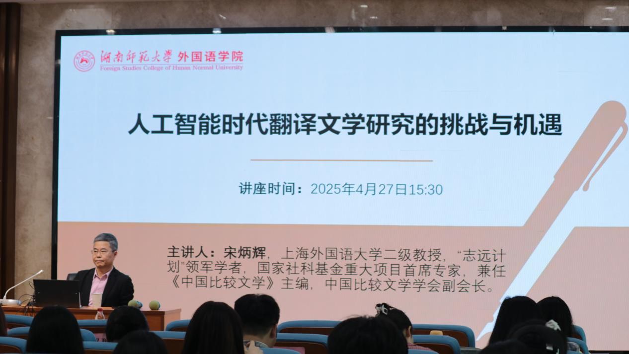2025年4月27日下午,《中国比较文学》主编、上海外国语大学宋炳辉教授受邀莅临永利集团官网,于腾龙楼学术报告厅515教室,为永利集团官网学生带来一场以“人工智能时代翻译文学研究的挑战与机遇”为主题的学术讲座。本次讲座由副院长蒋莉华教授主持,学院外国语言文学、人工智能、翻译等专业近百名硕士研究生参与本次讲座。