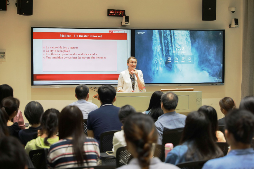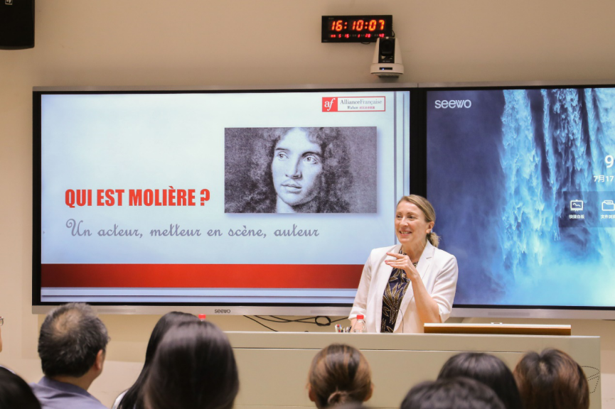 (通讯员 周俊辉 彭瑞雪)2022年6月13日(周一)下午四点钟,在永利集团3044欢迎光临腾龙楼304室,武汉法语联盟法方校长乐华女士(Mme Valérie LEROY)做客潇湘法语讲坛,为永利集团3044欢迎光临法语系师生做了题为《莫里哀的生平及作品分享会》的主题讲座。腾讯会议平台同步直播讲座,使国内外有兴趣的师生都能够实时参与。
