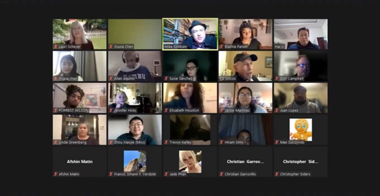 (通讯员 陈秀霞)11月24日上午11点,由美国加州州立大学洛杉矶分校《宣言杂志》、美国加州州立大学洛杉矶分校英文系、永利集团3044欢迎光临英美诗歌研究中心、永利集团3044欢迎光临共同举办的本学期第二次“开放麦”诗歌朗诵会在线上举行。活动特邀诗人Mike Sonksen主持,并邀请到众多诗人参加,如Allan Aquino、Luivette Resto、Forrest Wilson、Christopher Siders、Hiram Sims、Marcus Omari等。我校“潇湘学者”特聘教授、博士生导师Lauri Scheyer,以及英美文学方向博士生、“创意写作班”学生共同出席活动。