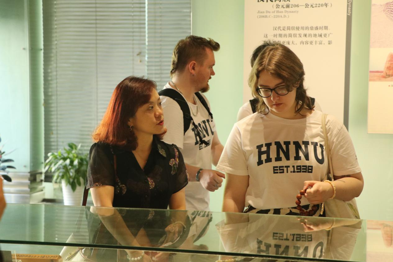 师生们转入《湘水流过——湖南地区简牍出土展》展厅,三国吴简的“柴米油盐账”让历史瞬间鲜活;里耶秦简中记录物资调运的"快递文书"再现秦代高效行政体系;走马楼三国吴简内详尽的赋税记录与市井账目生动勾勒出1800年前的社会生活点滴。今日英国学子们透过古人在简牍上留下的一道道承载文化符号的刻痕,静静倾听古老简牍“述说”着湖湘大地的历史日常和人文画卷,时空的界限瞬间消失,留存的则是对简牍文化深深的喜爱之情。