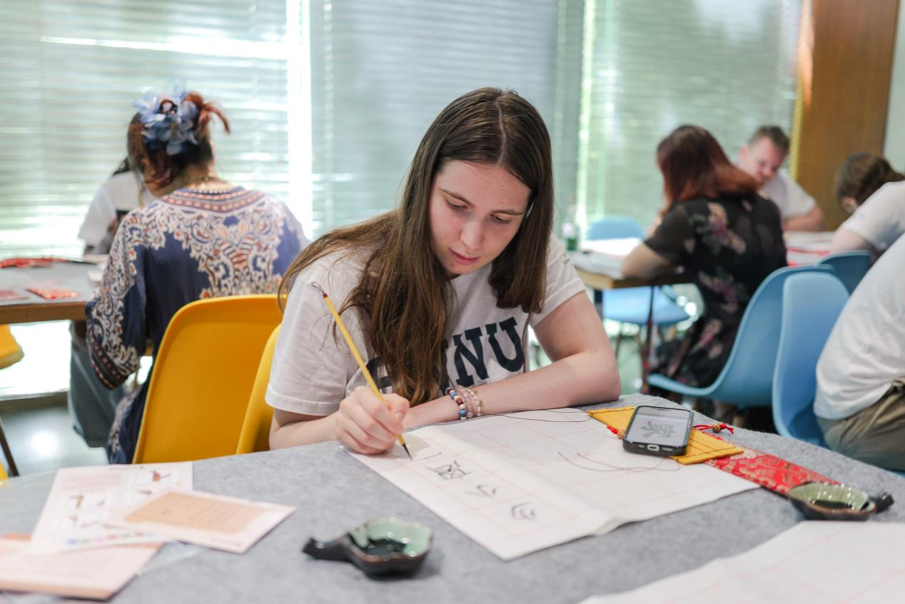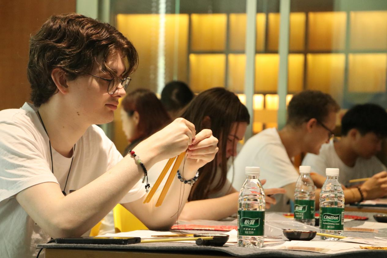 专题展厅参观结束后,中英师生们开启了简牍书写的沉浸式体验。他们亲手将竹片一一穿绳并编联成册,题之青睐的唐诗宋词,待墨汁晕染青简,卷之、捆扎并泥封,亲身体验中国古代简牍承载的厚重历史和深刻内涵。师生们纷纷表示一定将传统的简牍文化分享给身边的家人和朋友们,使他们了解简联制作的方法和技巧,让更多的人、更多的国家了解中国简牍承载中国文字和悠久历史的重大作用,从而全面、立体地了解中国和中国文化。