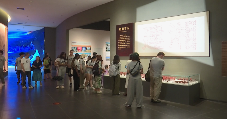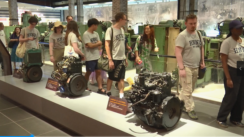 中英师生们走进衡阳老工业基地文展馆,观看历史实物,如墙上巨大的齿轮、展台上各色型号的柴油机、橱窗里的429枚建湘印章等,图文史料及多媒体展陈,系统了解衡阳作为工业基地的发展历程;车间办公室、钳工班、职工之家等场景展示则帮助师生们重现当年“衡阳制造”的工作环境和人文关怀。从早期工业的艰难起步到蓬勃发展,再到当前的转型升级,每一段历史都深深吸引着英国学子们的目光。他们时而驻足欣赏,饶有兴致地与身旁师生一同追溯“衡阳制造”的工业记忆。