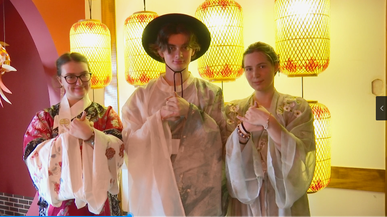 师生们穿戴上心仪的汉服和配饰,拾阶而上来到了三楼的唐朝诡事录VR国潮沉浸剧场,虚拟现实技术瞬间将大家拉回到唐代,体验VR技术打造的市井生活与悬疑剧情,使英国学员们沉浸式感受传统文化与现代科技的融合创新。大家非常喜欢这种中国传统服饰,而且又是第一次体验汉服,所以都兴奋不已。大家认为将汉服传统文化与现代科技相结合,令人耳目一新,仿佛穿越时空,亲身演绎大唐的传奇故事。