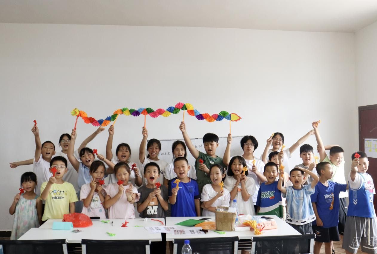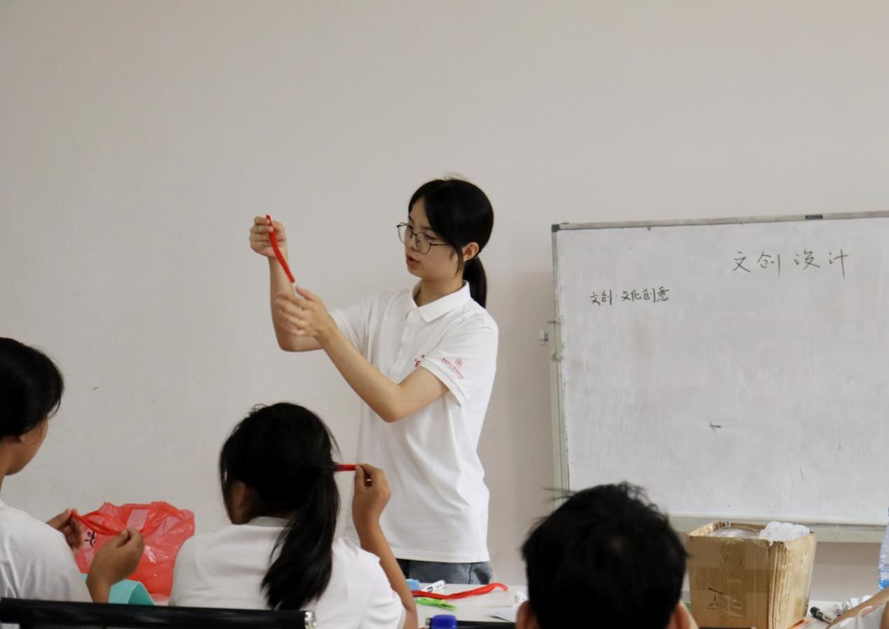 活动伊始,周欢从专业角度出发,向孩子们介绍了文创的概念及类别,并借助图文资料展示各地特色文创对当地旅游宣传的意义。随后,周欢分发卡纸、黏土、扭扭棒等材料,并将学生分为不同小组,组织进行文创设计。学生们结合家乡文化特色,将不同颜色的卡纸进行折叠、粘贴,组装成板板龙形;同时借助扭扭棒制作中国结、少数民族纹饰等作品。制作完成后,各小组选出代表,逐一上台介绍设计的文创背后蕴含的文化内涵及特色,周欢对作品进行了一一点评。活动最后,学生们与自己的文创作品进行合影留念。
