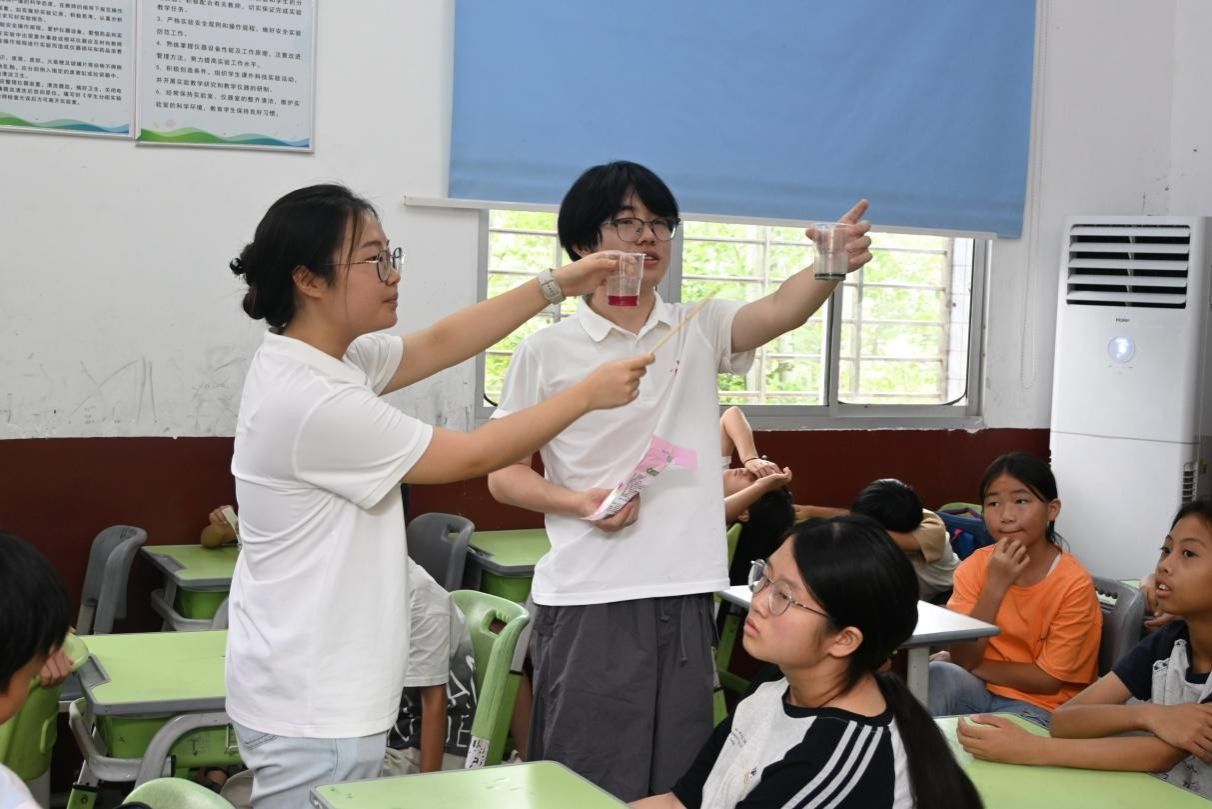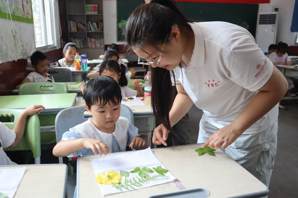“湖湘英烈故事”红色论坛活动中,苏星璨、周思晨结合当地红色资源,向小朋友们讲解攸县英雄谭震林的故事,并设计互动环节,引领孩子们用书信对话革命英雄;结合自身专业特色,李佳霖、朱慧婷等人开展多彩趣味课堂,带着孩子们在乐趣中掌握知识;刘偲颖、周婷带领孩子们敲拓花草制成创意毛巾,制作扭扭棒鲜花、传统剪纸,帮助孩子们发现美、欣赏美、创造美;操场上,王培亘、张灿雯通过组织健美操学习和趣味体育活动,培养孩子们的运动兴趣和团队协作精神,促进其身心健康发展;立足儿童劳动实践,周昱希、陈景杰设计水仙种植、垃圾分类等环节,让劳动教育融入童趣。
