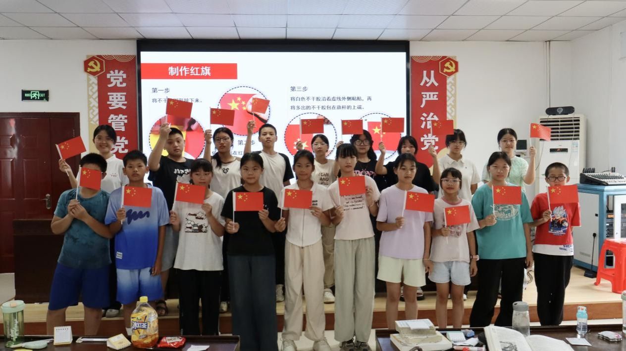 随后,陈星宇结合中国近代历史,与学生们分享了国旗诞生的过程,并借助影视资料展现“新中国第一面国旗”成功升起背后的动人故事,进而强调尊重爱护国旗的重要性。课程最后,学生们借助不干胶和小棒制作了一面面小国旗,并与实践队员一道合影留念。