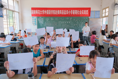 双语课堂是文化传播的“活教材”。实践团围绕渣江镇本土文化,设置“风味美食”“风景人文”等系列课程,融入“图画+英语”“情景模拟”等教学形式,指导学生用双语介绍渣江米粉、衡阳鱼丸等特色美食,以及南岳衡山、石鼓书院等自然人文景点,使方言词汇与乡土记忆通过双语转换形成具体可感的表达。